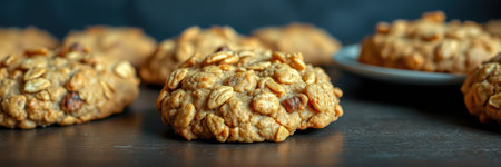 Freshly baked oatmeal cookies arranged on a dark kitchen counter with a plate of cookies in the background