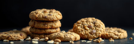 Oatmeal, fig, hazelnut, pistachio and sesame cookies on a black background. Enjoyable snack.