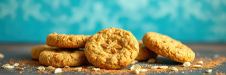 Delicious homemade oatmeal cookies stacked on a wooden surface with an appealing blue background