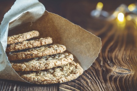 Homemade Oatmeal cookies in a pastry paper bag baking on a wooden rustic table Winter holiday still life Christmas or New Year card
