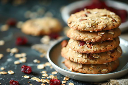 Delicious oatmeal cookies with cranberries and nuts arranged on a clean surface for a tempting snack