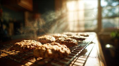 A beautiful display of freshly baked cookies cooling on a wire rack, with steam rising in a warm kitchen, showcasing the cozy atmosphere and delightful aroma.