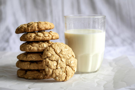 Oatmeal cookies close up view. Stack of homemade delicious rolled oats cookies on table napkin, oat flakes and milk bottle. Morning breakfast table background.