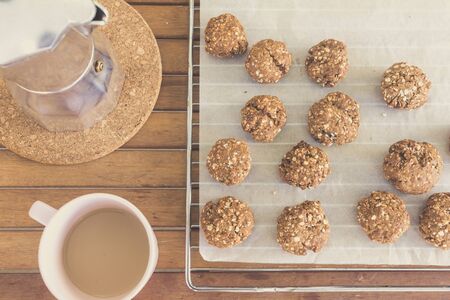 topview homemade oat cookies, coffee cup and moka pot on light background