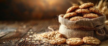 Freshly baked oatmeal cookies with raisins and nuts sit in a brown paper bag on a rustic wooden table, inviting a warm breakfast experience in a bright kitchen, banner