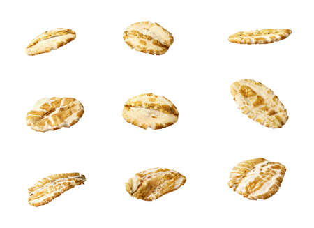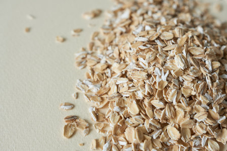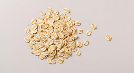 A pile of dry rolled oat flakes scattered on a plain light grey background. Clear details and vibrant colors e...