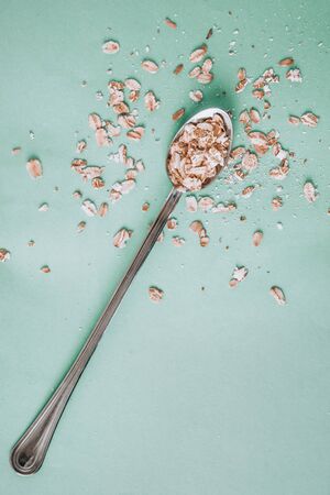 Top view of an iron spoon filled with oatmeal and scattered on a blue background. healthy food
