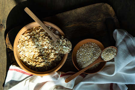 A tablespoon of rolled oats on a wooden background.