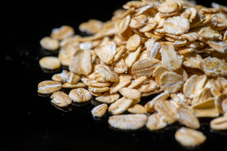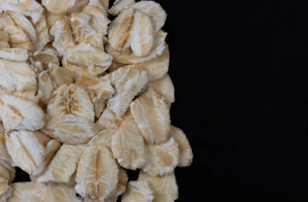 Macro image of rolled oats on a black background with copy space of the right half