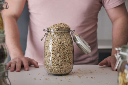 Unrecognizable latin man with a jar full of oat flakes. Food in bulk.