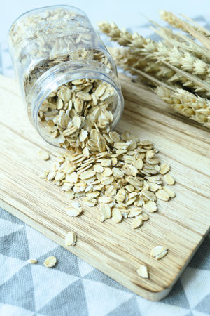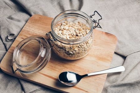 Transparent glass jar with rolled oats. Cereals in a bowl with metal spoon on wooden chopping board and rustic napkin