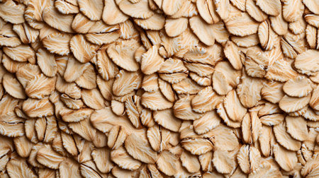 A closeup, topdown view showcases a dense arrangement of rolled oats, highlighting their natural texture and warm, earthy tones.