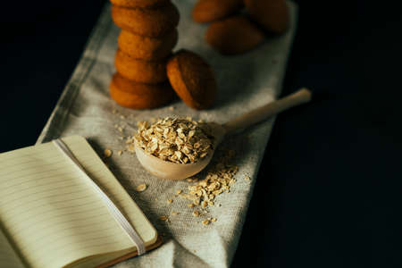 Oat flakes in large wooden spoon on napkin with stack of fresh oatmeal cookies, open notebook on black background. still-life