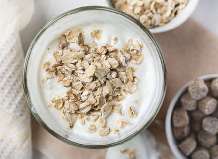 Yogurt with oat flakes on a wooden table closeup shot, top view.