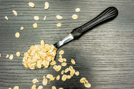 The spoon lies on top of dry oatmeal, and is wrapped in an inch. Healthy breakfast, diet, proper nutritio. Place for text