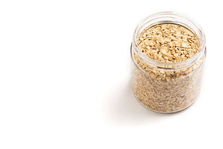 Side view of a jar of oat flakes isolated on white background