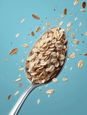 Oats rest in a silver spoon, beautifully suspended against a vibrant blue background.