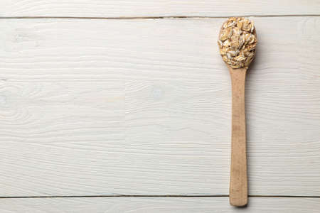Dry oatmeal flakes in a wooden spoon on a white wooden table. healthy nutrition. healthy food. top view