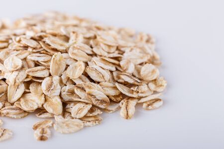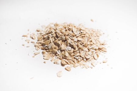 Oat flakes on a white background. Close-up. Healthy food.