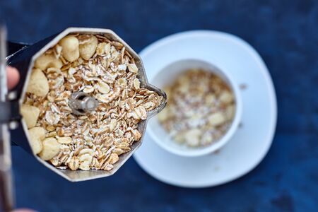 Oat-flakes, coffee on blue background. Cereals.