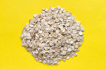 Pile of oatmeal on a yellow background, top view. Raw dry oatmeal.