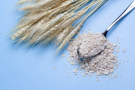 dry oat flakes in a spoon and ears of wheat on a blue background. the concept of natural healthy food.