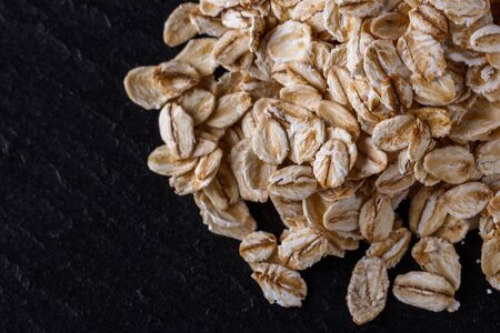 raw oatmeal on a dark stone slate background.