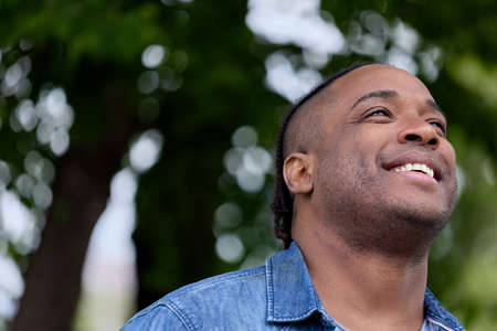 Portrait of handsome, young African-American professional businessman in a denim shirt against a backdrop of green trees on a sunny summer day. Calm, confident and smiling man looks into the distance