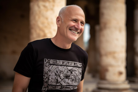 Portrait of a smiling middle-aged man in front of an ancient temple.