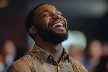 Close-up portrait of a bearded African American man laughing heartily with his head tilted back, radiating pure joy and happiness.