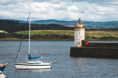 An empty promenade to the old lighthouse, close-up. Rocky shores in the background. Dramatic cloudscape. Ardrishaig, Crinan canal, Scotland, UK. Travel destinations, sightseeing theme
