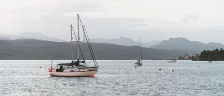 Small sailboats anchored on mooring near the shores of Firth of Clyde. Rhu, Scotland, UK. Old church in the background. Dramatic stormy sky. Sailing, sport, recreation, tourism, travel destinations