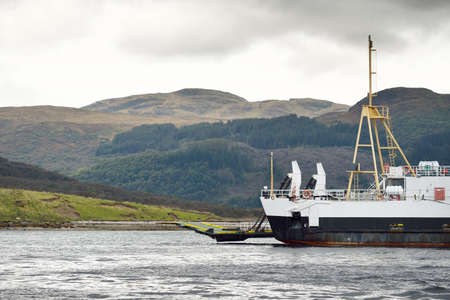 Ro-ro passenger ship sailing near the rocky lake shores on a cloudy day. Rothesay, Scotland, UK. Nautical vessel, transportation, ferry connection, cruise, tourism themes