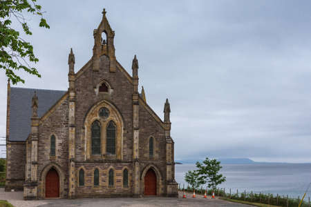 Gairloch, Scotland - June 10, 2012: The Free Church of Scotland brown stone building on the shore of the blue-gray Atlantic Ocean. Light blue sky. Vegatation adds green.