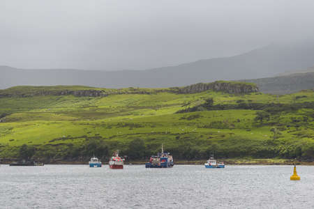 Fishing boat sailing near the rocky shores of Tarbert under dramatic sky. Scotland, UK. Travel destinations, food industry, traditional craft, environmental damage and conservation