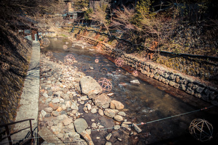 Shibu Onsen hot springs town and Yokoyu river taken early in the morning during winter. Famous onsen town in Nagano prefecture, Japan. Taken on January 23 2023