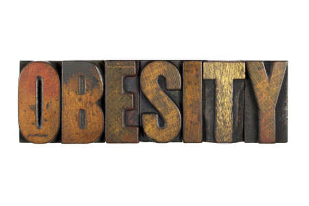 Obesity isolated on white and written in vintage letterpress type