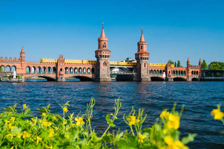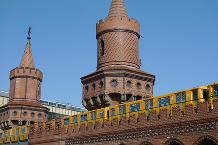 train crossing the Oberbaum bridge in Berlin, Kreuzberg on a sunny day