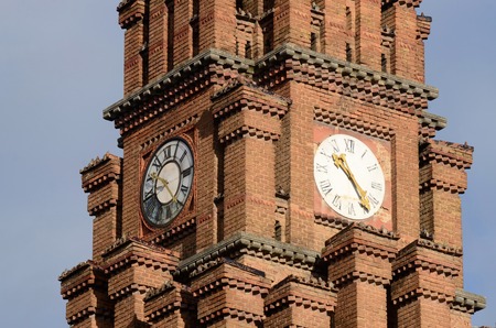 Clock at Psalmists school tower, former architectural archiepiscopal residence complex,Chernivtsi,Western Ukraine,