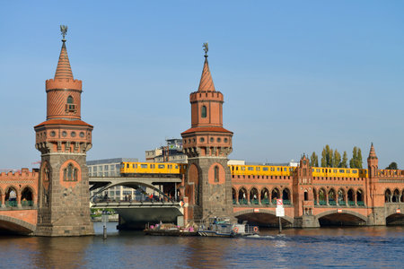 View of the yellow U-Bahn train crossing the iconic Oberbaum Bridge over the River Spree in Berlin, Germany, on a sunny day