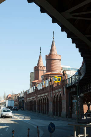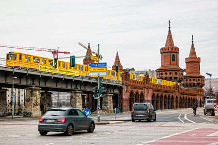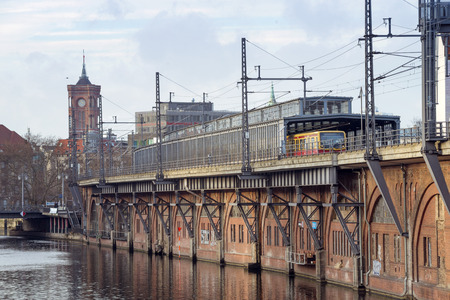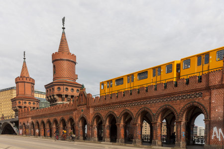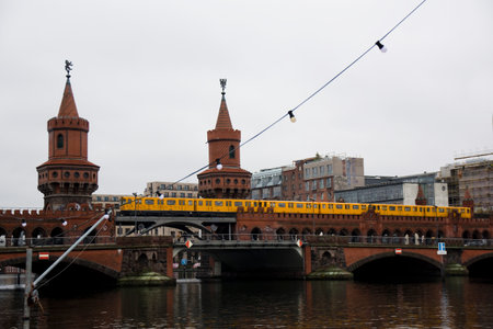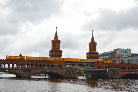 BERLIN, GERMANY - circa 2016: A panoramic view of Berliner U-Bahn with Bridge Oberbaumbruecke