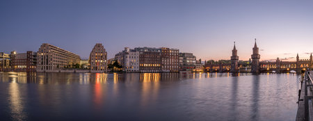 Panorama of the river Spree with the beautiful Oberbaumbruecke in Berlin at twilight
