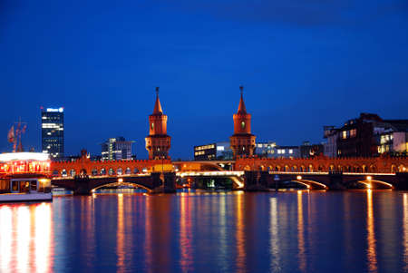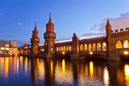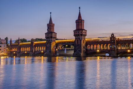 Oberbaum bridge over spree river at twilight in Berlin, Germany