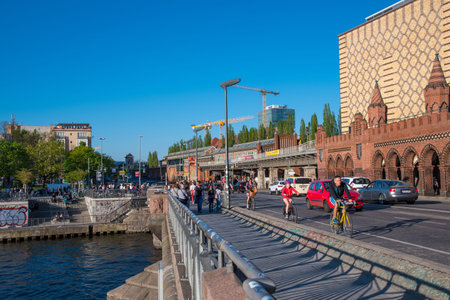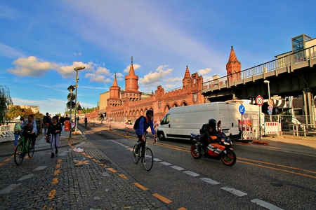 Berlin Germany - April 21. 2018: pedestrians, cyclists and cars on the Oberbaum Bridge