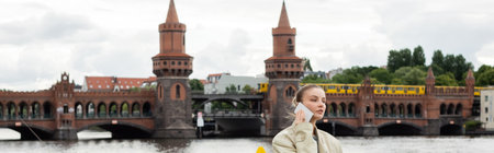 Woman talking on mobile phone with Oberbaum bridge at background in Berlin, banner