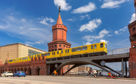 train crossing the Oberbaum bridge in Berlin, Kreuzberg on a sunny day