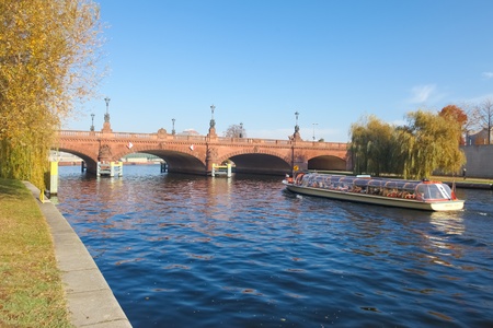 BERLIN - NOVEMBER 3, 2011: Tourist boat near Moltkebrücke bridge on river Spree on November 3, 2011 in Berlin, Germany. River Spree is approximately 400 kilometres in length.