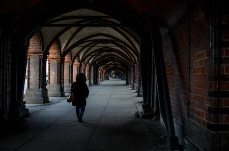 BERLIN, GERMANY, MARCH 12, 2015: brick arcs of oberbaumbrucke creates covered passage for pedestrians in berlin.