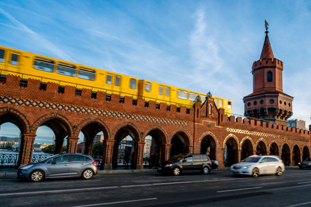 Berlin, Germany - May 09, 2016: A yellow metro crosses the Oberbaum Bridge over the river Spree during a sunset on May 09, 2016 in Berlin.