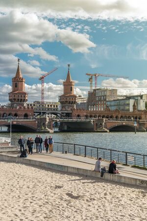 BERLIN, GERMANY - September 26, 2018: Panorama of Berliners sitting by the Spree river, near the East Side Gallery with the Oberbaum Bridge in the background, a symbol of Berlins unity